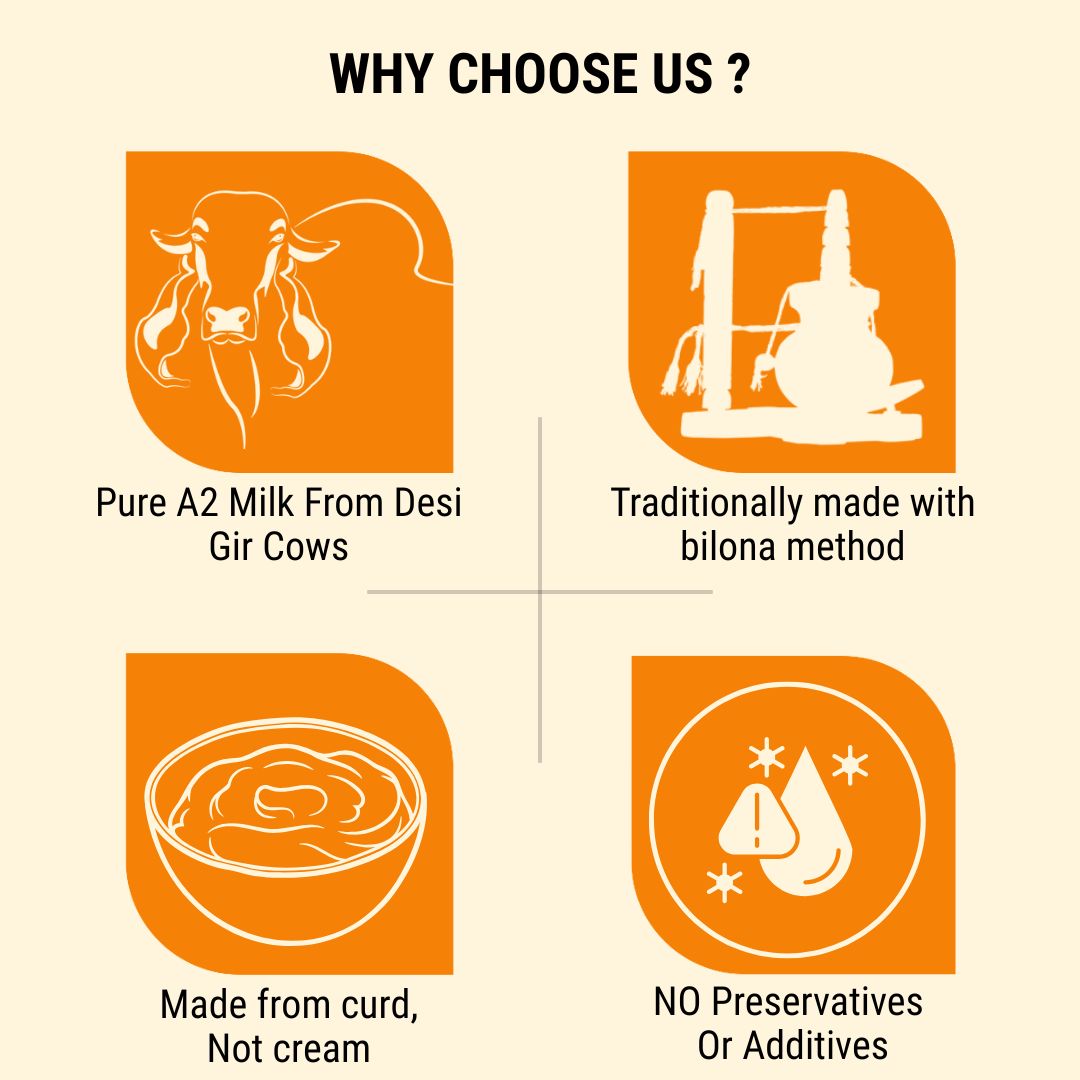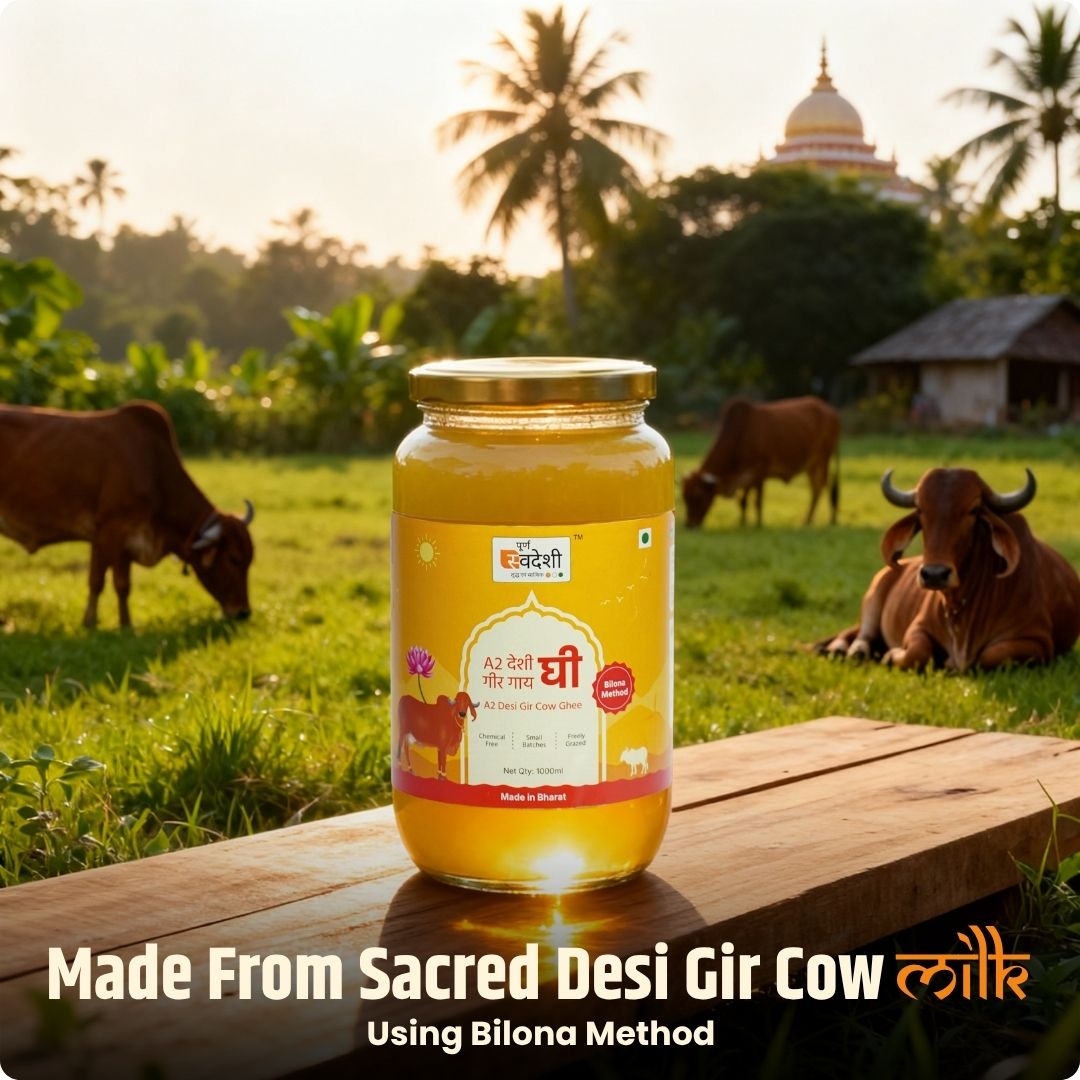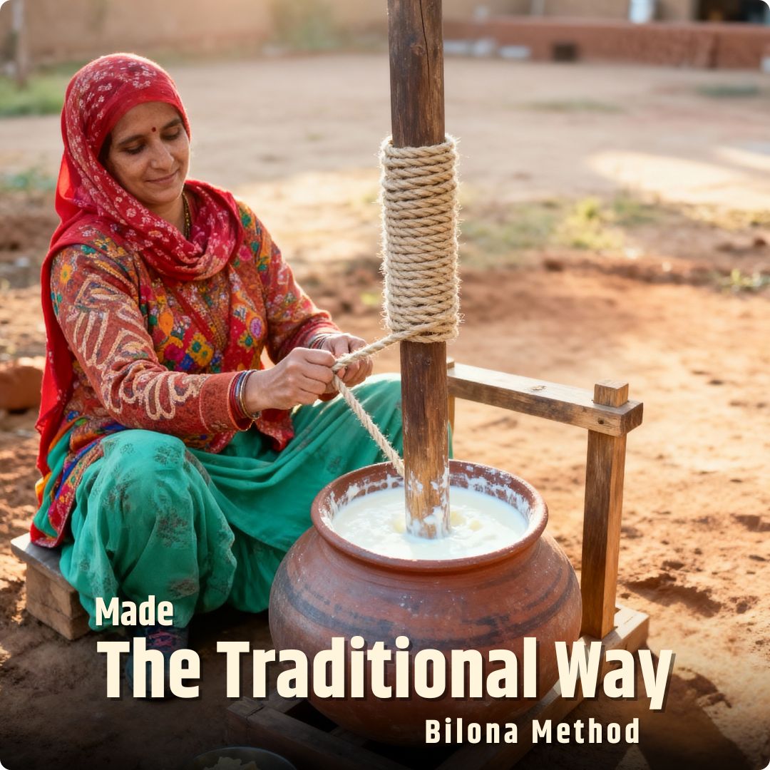- Curd → Butter → Slow-heated Ghee — the age-old process.